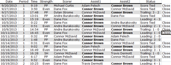 Brown has 11 goals, with nine in games with the score ‘close’ in which are the same parameter definitions as those for the NHL are used. The game ‘close’ is when the score is tied or within one goal in the first two periods and tied in the third period.