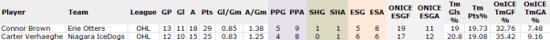 For example, Brown was on the ice for 19 goals and 11 goals against, giving a ratio of 1.73 (ESGF/ESGA). For Verhaeghe, this ratio is 1.42 and the average in the OHL, among regulars with a minimum 10 games played is 1.18.