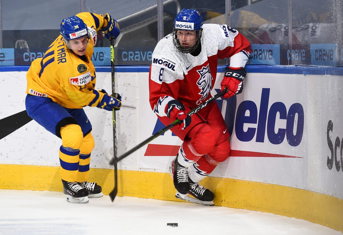EDMONTON, AB CANADA - DECEMBER 26: Czech Republic's David Jiricek #8 battles for puck possession against Sweden's Arvid Costmar #14 in preliminary round action at the 2021 IIHF World Junior Championship at Rogers Place on December 26, 2020 in Edmonton, AB Canada. (Photo by Matt Zambonin/HHOF-IIHF Images)