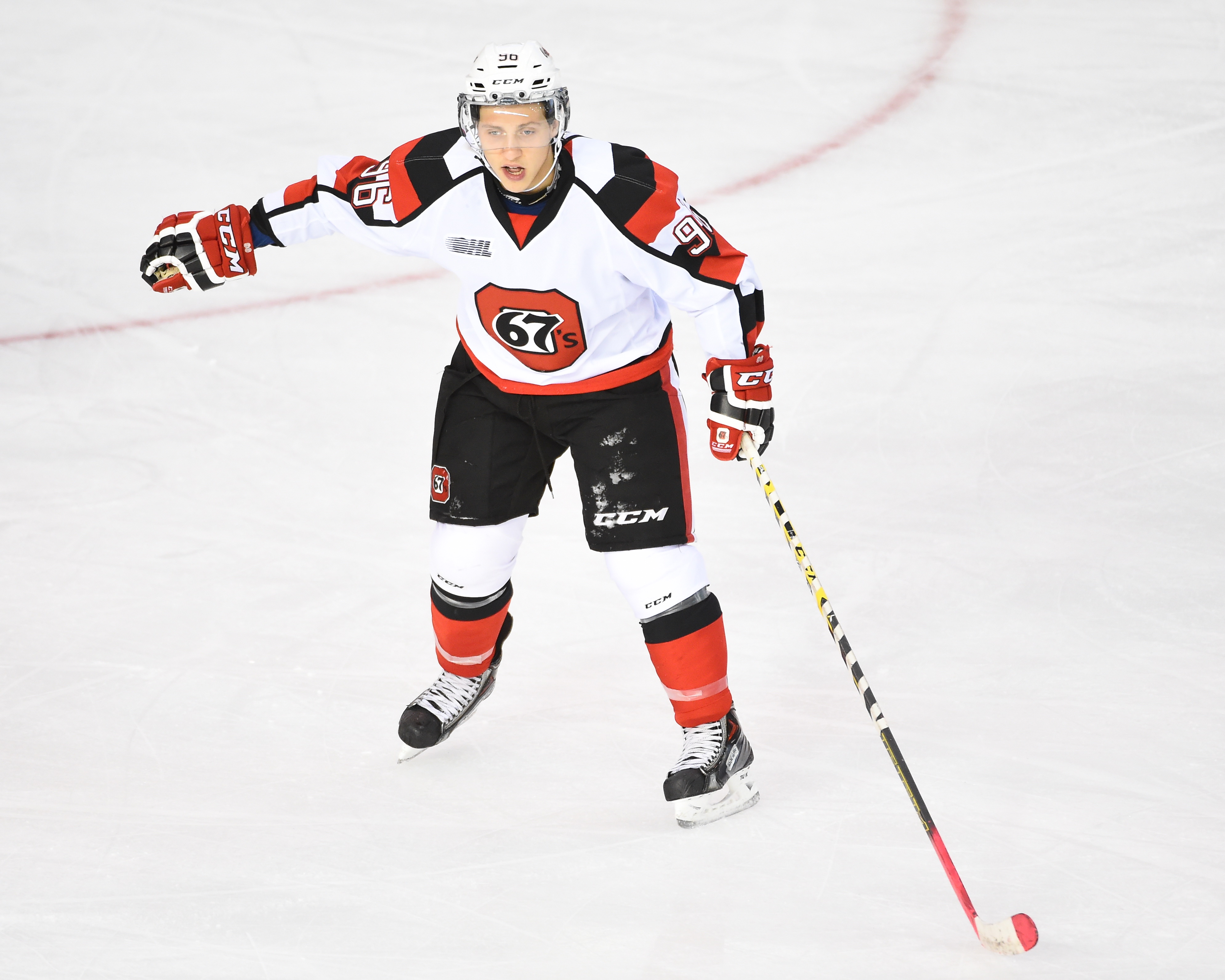 Skating at 6-foot-7 and it’s not surprising that first-year OHL defenseman Chris Martenet is drawing attention from scouts. On a young and inexperienced London blue line, Martenet has been a welcome addition and he’s improving with each passing game. His lanky long stride allows him to cover ice quickly and with his wide-wingspan Martenet has shown to be very difficult to beat on the outside. For a big man, Martenet owns good mobility and he hasn’t been shy to carry the puck up ice either. Gathering points will never be Martenet’s go-to skill set but he’s proving to be very valuable, replacing the tough minutes left behind after Nikita Zadorov’s departure last season. He’s very raw as a prospect but it’s hard not to love his size (obviously) and his overall demeanour/confidence on the ice is very attractive as well.