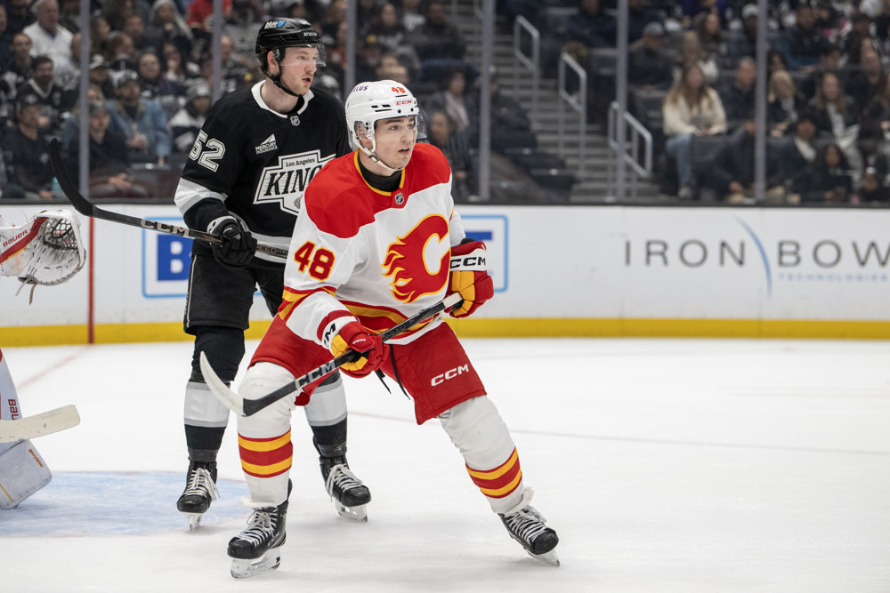 LOS ANGELES, CA - APRIL 17: Calgary Flames Defenseman Hunter Brzustewicz (48) watches play during a Los Angeles Kings game versus the Calgary Flames on April 17th, 2025, at the Crypto.com Arena in Los Angeles, CA. (Photo by Rob Curtis/Icon Sportswire)