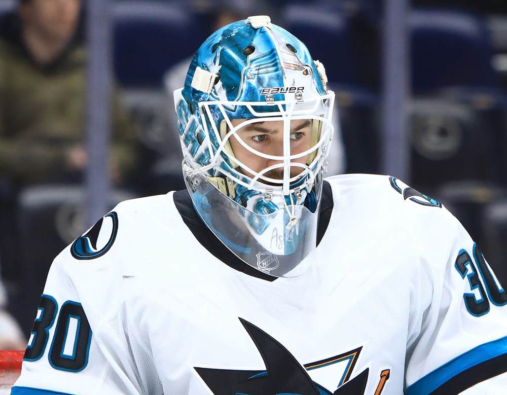 NASHVILLE, TN - JANUARY 21: The artwork on the mask of San Jose Sharks goalie Yaroslav Askarov (30) is shown prior to the NHL game between the Nashville Predators and San Jose Sharks, held on January 21, 2025, at Bridgestone Arena in Nashville, Tennessee. (Photo by Danny Murphy/Icon Sportswire)