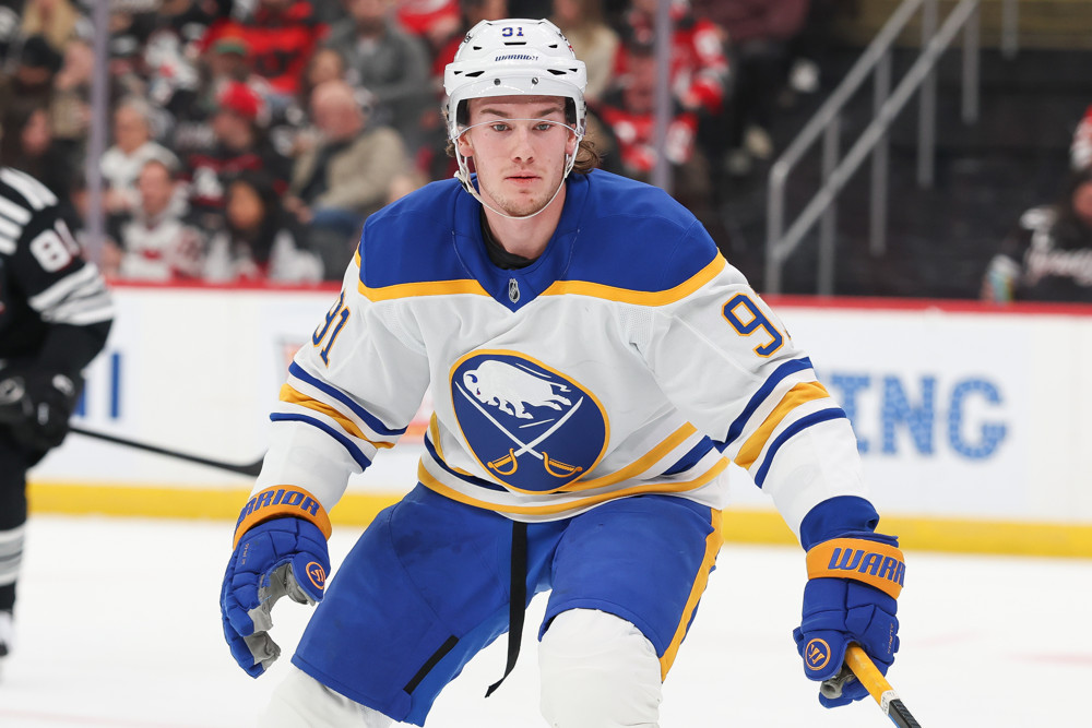 NEWARK, NJ - DECEMBER 21: Josh Doan #91 of the Buffalo Sabres skates during a game between the Buffalo Sabres and New Jersey Devils at Prudential Center on December 21, 2025 in Newark, New Jersey. (Photo by Andrew Mordzynski/Icon Sportswire)
