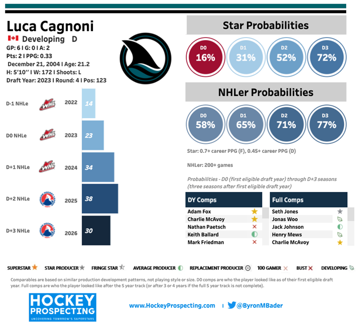 Offensive defensemen with this profile often depend heavily on deployment and freedom to create, and as competition increases, time and space shrink quickly. His Hockey Prospecting model now places him at a 72% chance of becoming a star, though lofty comparables such as Seth Jones, Charlie McAvoy, and Adam Fox are far from likely outcomes. From a roster construction standpoint, San Jose does not yet have a long-term power-play quarterback in place, which creates opportunity, though it would not be surprising if they address that externally. With Dmitry Orlov and Sam Dickinson the only defensemen signed beyond this season, there is organizational flexibility, but also uncertainty. If another manager is already valuing Cagnoni at his upper projection, this may represent an ideal window to sell, particularly given that his fantasy value may ultimately lean more on opportunity than guaranteed role.