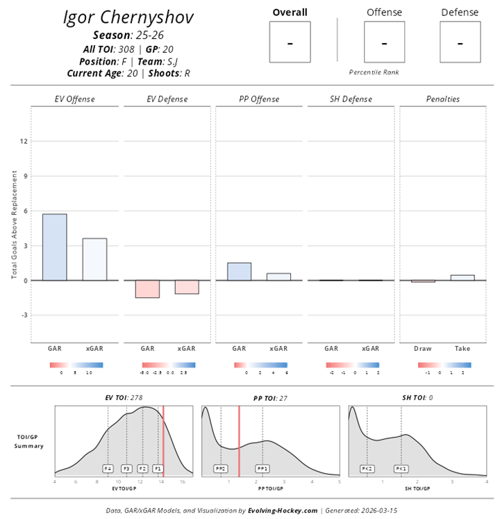Musty entered the Sharks system with considerable momentum after producing impressive offensive numbers in junior hockey, with his combination of size and skill suggesting the foundation of a potential power forward capable of generating NHL offense. He has made a solid transition to the professional level this season, though his pNHLe has dipped below 60, reinforcing some of the uncertainty in his projection. Much of Musty’s earlier production came in favorable offensive deployments and strong supporting environments, and as competition increases, players whose scoring is tied closely to usage can face a more difficult adjustment. The live and statistical profile is beginning to point toward a player who contributes offensively, but perhaps not as a primary driver.