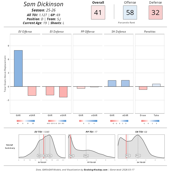 Dickinson possesses many of the traits NHL organizations value in modern defensemen. He combines size, mobility, and puck-moving ability while defending with physical presence, a toolkit that on paper suggests a highly projectable NHL blueliner capable of handling significant minutes. He has already carved out a meaningful role on a surprisingly competitive Sharks roster this season, though notably with the lowest average time on ice among their defensemen. That usage begins to make more sense when paired with his underlying performance, where flashes of offensive contribution have been offset by inconsistent reads and decision-making that have driven below-average defensive results.