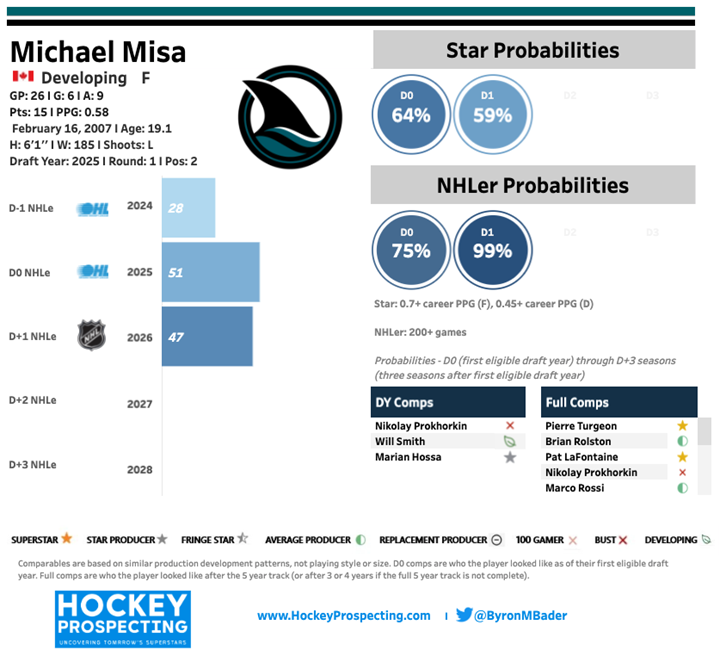 Misa is an important piece of San Jose's rebuild and the type of elite prospect dynasty managers should covet. His toolkit combines high-end skating, advanced playmaking vision, and offensive intelligence that projects toward a top NHL player. Misa processes the game quickly, often anticipating plays before they fully develop and manipulating defenders through subtle puck movement. Some may look at what Misa is doing this season and be tempted to lower his stock, but that would be a mistake, as would drawing comparisons to what Matthew Schaefer is doing on Long Island to manufacture a bust narrative.