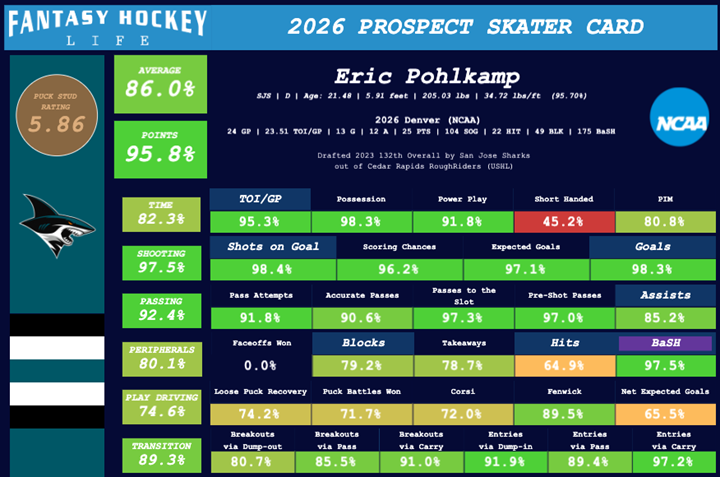 Pohlkamp has been outstanding for the University of Denver this season, emerging as a true do-it-all defender with greatly increased scoring. What makes his profile even more compelling is that the offense is only part of the story, as his play driving and transition game have been elite, with his Fantasy Hockey Life skater card showing green across the board. Beyond the flashier contributions, he also projects to provide a high peripheral floor through blocks, shots, and hits, giving dynasty managers a well-rounded asset at a modest cost. For those willing to do the homework on under-the-radar college defenders, Pohlkamp is exactly the type of name worth targeting before the broader market catches up.