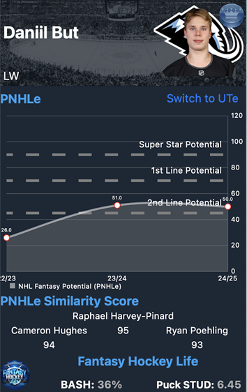 According to the NHL Rank King application, But projects as a sub-60-point player at his peak, which limits his fantasy appeal without strong peripheral contributions. Since his blocks, shots, and hits contributions are more modest, his real-world effectiveness may not mirror fantasy value. While he appears likely to carve out a steady NHL career, the upside for dynasty formats looks capped. This is a moment to consider selling before his market adjusts to a more modest projection.