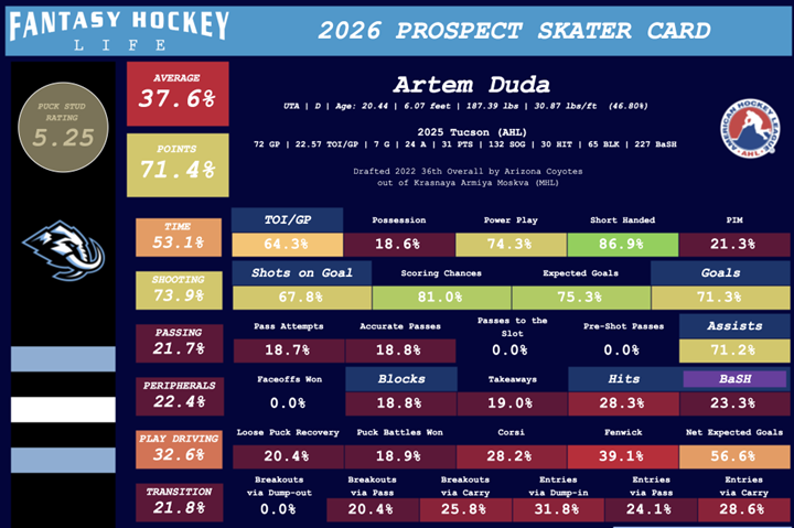 Duda made his North American debut with Tucson in the AHL last season and held his own against older competition. His combination of skating, offensive instincts, and vision on the power play continues to stand out, and his transition game hints at real top four potential. His Fantasy Hockey Life skater card suggests there is still some growth ahead before he reaches his ceiling, which only reinforces his value as a long-term investment.