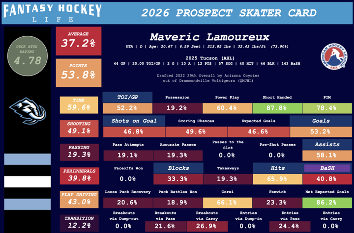 Standing at 6-foot-7 and carrying significant physical presence, Lamoureux draws intrigue. He’s shown flashes of activation in the offensive zone and throws his size around on defense, but his developmental curve is slow. In his first full AHL season he posted 13 points in 42 games with Tucson, plus a brief stint in the NHL for 15 games with Utah. Even so, there is little evidence to suggest he will ever be a reliable fantasy scorer, especially given his lack of history producing offense in prior leagues.