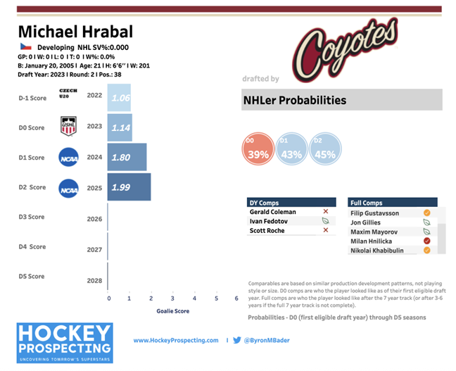 With Connor Ingram no longer in Utah, Hrabal’s long-term path to the crease looks much clearer. Karel Vejmelka is the only real obstacle between him and a future starting job, and Hrabal has the tools to seize that role within a few seasons. His development has been steady, his track record strong, and his Hockey Prospecting profile shows promising comparables in Filip Gustavsson and Nikolai Khabibulin. Those would be excellent outcomes for the Mammoth, and they highlight just how valuable Hrabal could become as a long-term dynasty stash.