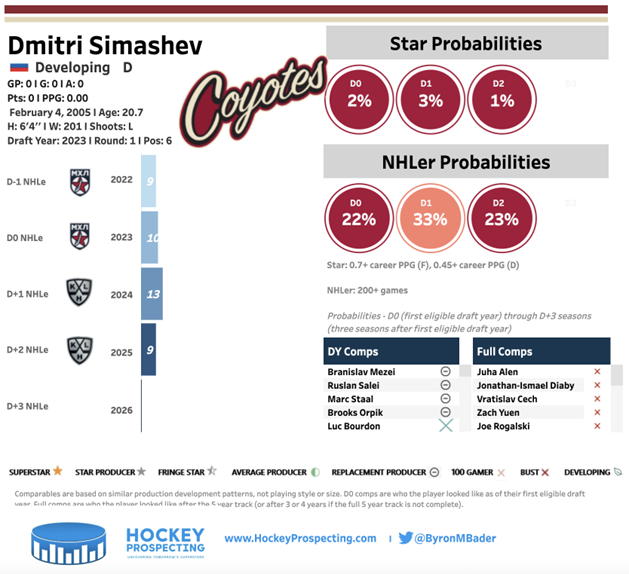 Simashev is a smooth-skating, defensively reliable blueliner, but his fantasy upside is limited. Across 137 KHL games, he has recorded only 16 points, and he has never shown a consistent scoring touch in any league he has played. His skating and defensive awareness make him a valuable real-world player, yet his offensive instincts and involvement in transition remain muted. Given that he is unlikely to run a power play, his point totals may stall out in a second-pair, shutdown role.