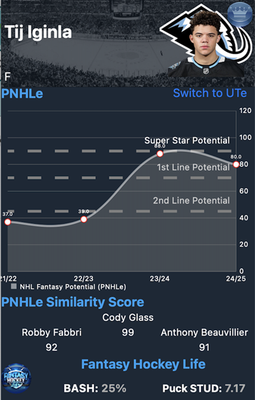 Iginla appeared in just 24 WHL games last season, and that missed time understandably cooled some of the enthusiasm surrounding his breakout. For dynasty managers, that lull represents a clear buying opportunity. Before the injury, he was producing at an impressive clip and showing the shot, compete, and puck-driving ability that made him a top ten draft selection. Despite the limited action, his pNHLe via the NHL Rank King application remains near a point per game, reinforcing that his offensive trajectory is still on track.