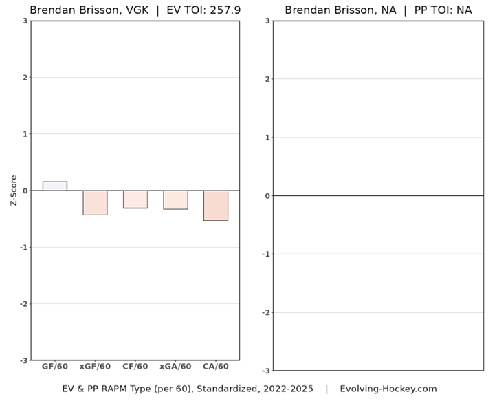 Brisson’s shot has always been his standout tool, and he built a strong reputation through his draft pedigree and international play. However, he was unable to crack the lineup with the Vegas Golden Knights, which was an early warning sign that his game might not translate as well as hoped. After being traded to the Rangers, he now faces another crowded forward group with limited openings in the top six. His RAPM chart via Evolving Hockey shows that his offensive impact, measured through expected goals, is not above NHL average, and his defensive results are poor. There simply is not enough value away from the puck to offset the inconsistency in his scoring.