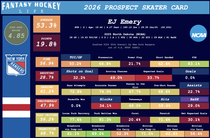 Emery brings size, reach, and strong defensive instincts, which give him a very clear path to the NHL. He is already advanced as a transition and shutdown defender, and his play at North Dakota reflected that, as seen in his Fantasy Hockey Life skater card. Coaches will love his ability to kill plays early, win battles, and make smart exits under pressure. In real hockey terms, he is the kind of steady, reliable blueliner teams trust in difficult minutes.