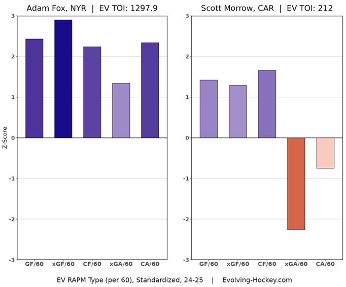 Morrow may never completely replace Adam Fox, but the gap might be smaller than people think. His size, mobility, and offensive instincts make him one of the most intriguing blueliners in the Rangers’ system. Adam Fox’s production has quietly trended downward over the past few seasons, and after his poor performance at the Four Nations Face-Off, there is growing scrutiny about who might eventually take over top offensive duties. Importantly, Morrow’s Regularized Adjusted Plus-Minus (RAPM) chart via Evolving Hockey from last season shows that, in limited NHL action, he already drives offense at a high level. He does, however, still need to refine his defensive acumen, which is typical for young offensive defensemen. If the Rangers split power-play units or Fox misses time, Morrow is the most likely candidate to step in.