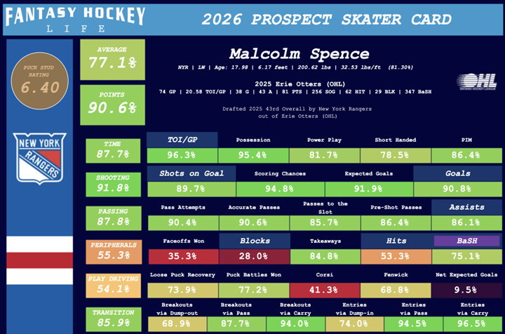 Spence’s speed, energy, and relentless motor made him an exciting draft pick, and his compete level is one of the best in his class. He plays with pace, tracks well, and does all the little things coaches love. However, from a fantasy perspective, his offensive toolkit is not as refined as other forward prospects, and he profiles more as a middle-six complementary winger than a primary scorer. His fantasy hockey life skater card shows a solid peripheral floor, but without strong point production, that alone will not carry his value in most formats. In short, he is likely to be a better real-life player for the Rangers than a high-end fantasy asset.