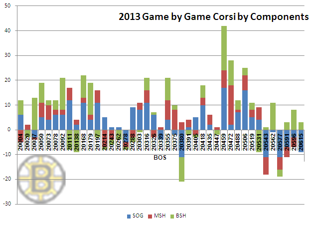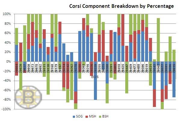 The percentage breakdown by component mirrors the six-game slump shows that most of the Corsi makeup has been dominated by the shots differential on the negative side, and the shot blocking component as the only positive. Boston has to get more pucks on net.