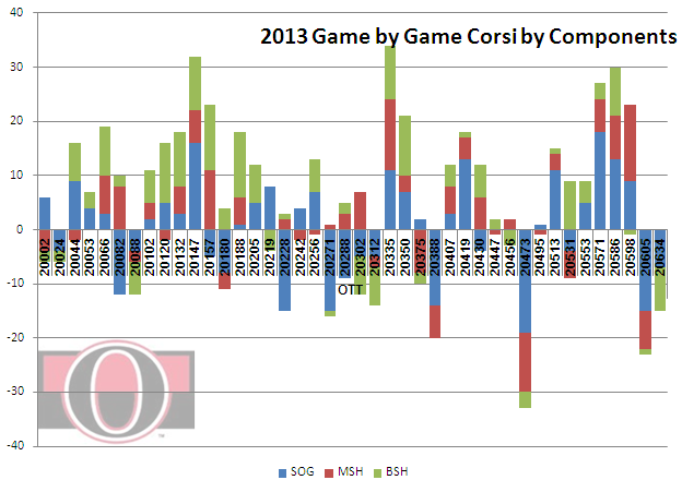 This is the game by game Corsi breakdown for the Senators. Keep in mind the length of injuries to some key players among others and including the bumps and bruises from the group remaining in the lineup. Jason Spezza, Erik Karlsson and Craig Anderson, Milan Michalek, all key players that missed time, but the chart doesn’t seem to reflect that.