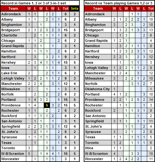 To this point, North Division leading Utica Comets and West Division Oklahoma City has yet to play a 3-in-3 set. Presented below are the records for team sets.