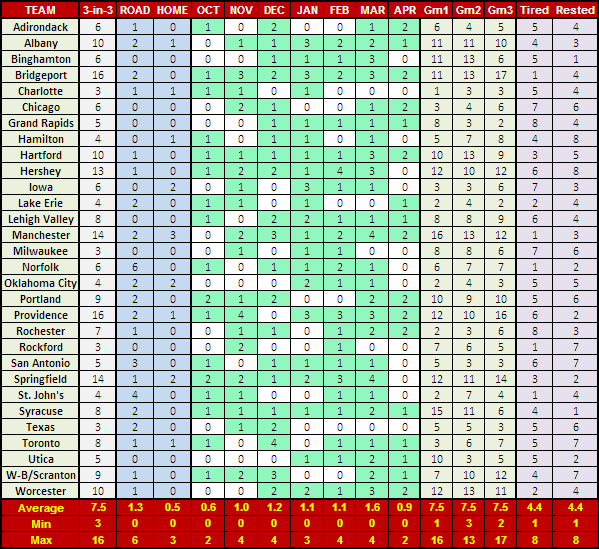 The Gm1, 2 and 3 columns represent the amount of games the listed team has against opposition in the midst a 3-in-3 set. Bridgeport – and Providence – lead the AHL with 17 and 16 games respectively facing a team playing Game 3 of a 3-in-3. The AHL Average is 7.5.